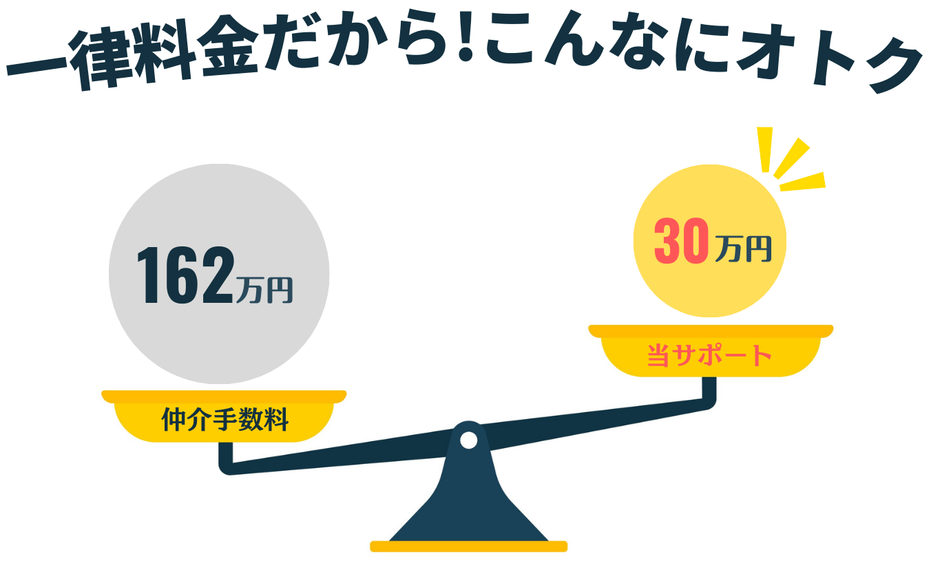 そこで私たちがお役に立ちます!当サービス「おまかせフルサポートプラン」なら、不動産の価格に関わらず一律でサポート。サポート料金も格安だから、ほとんどの場合で不動産業者に支払う仲介手数料よりもお得になります(※物件価格が326万円以上の場合、当サービスのほうがお得です)。